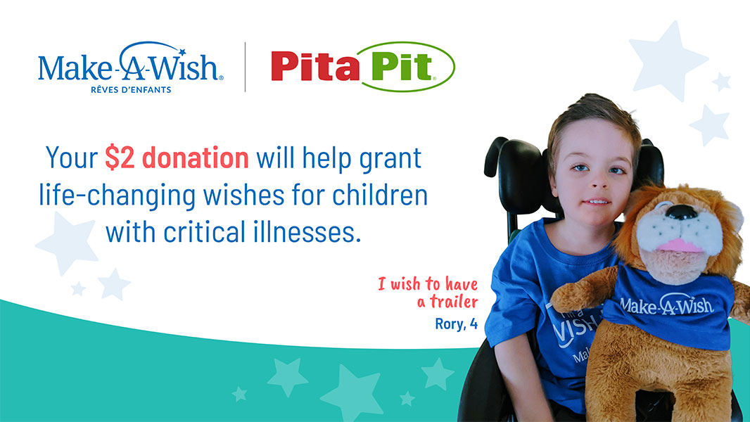 April 4, 2022 Pita Pit is partnering with Make-A-Wish Canada for the 5th year to help create hope for children with critical illnesses. The campaign will run from April 11 to April 29, 2022, raising much-needed funds by asking customers to make a donation when they purchase their item (online or in-store). Additionally, a generous donation of $1 from every pita sold will be made from participating locations on World Wish Day, which takes place annually on April 29th and marks the anniversary of the wish that inspired the founding of Make-A-Wish.