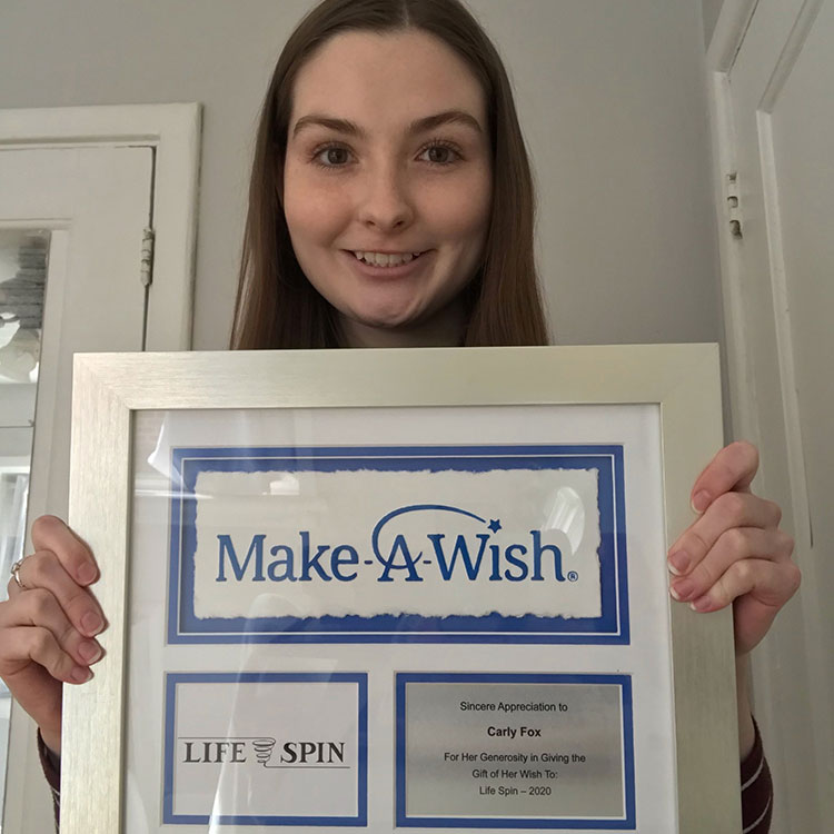 She and her twin sister, who is also a wish kid, originally wished to go on a European cruise with their family. Because of COVID-19, Carly’s travel wish was paused, and she decided to wish it forward, and donate the funds allocated for her wish to Life Spin (a local anti-poverty charity) to help those affected by the pandemic. Carly’s mentor and former teacher, who unfortunately passed away earlier last year, introduced her to Life Spin and taught her the importance of giving back to the community. Her wish helped Life Spin provide toys to more than 120 families across her hometown for Christmas.