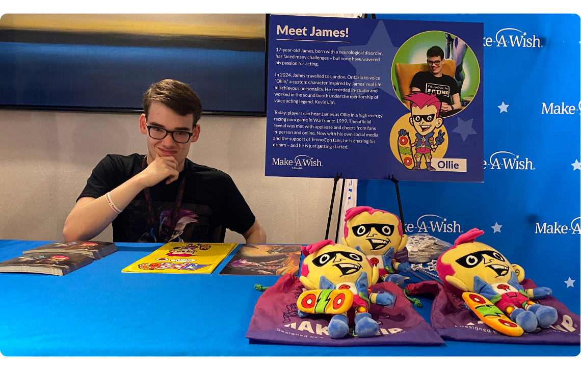 For us at Make-A-Wish Canada, our connection to gaming and streaming goes beyond fundraising; it is part of the wish experience itself. Gaming related wishes are the second most popular wish type in the world with over 160 gaming wishes fulfilled in the past two years. One powerful example is James, whose wish was granted in 2024. James wished to be a voice actor, and that wish came true when the team behind the popular game Wareframe created brand new mini game and character, Ollie, just for him. Today, James is a celebrity in the Warframe community and even has his own plushie! James’s experience shows just how powerful a wish can be, turning dreams into life-changing memories.